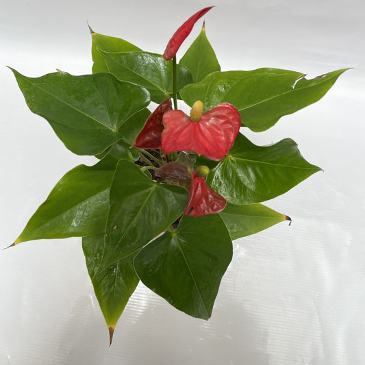 Red anthurium in ceramic pot